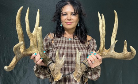 SS-829 FLAWLESS AND SUPER FRESH FROM SPRING 2025 SCORING 198-3" BC GROSS~ ESTIMATED 18" INSIDE SPREAD~ H1'S ARE 5-4" AND 5-3"~ LONGEST TINE IS 10-2"~ MAIN BEAMS ARE 22-6" AND 23-6"~ MATCHING INSIDE NON TYPICAL POINTS ARE 10-2" AND 9-3"~ FRESH WITH WAX RINGS~ $400 |