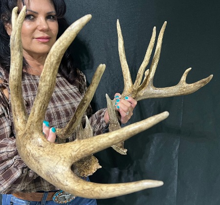 SS-825 HEAVY SET OF SHEDS SCORING 161-3" BC GROSS WITH ESTIMATED 19-0" INSIDE SPREAD~ H1'S ARE 5-4" AND 5-2"~ LONGEST TINE IS 8-5"~ MAIN BEAMS ARE 24-0" AND 24-3"~ COUPLE TINY NATURALLY CHIPPED TIPS WITH SUPER NICE COLOR~ COUPLE SMALL SPOTS WHERE THE OWNER WROTE THE DATE POSSIBLY ON THE BACKS OF THE BURRS IN MARKER~ ALMOST GONE AND CAN'T SEE IT ANY MORE, ASK FOR PICS IF YOU WANT~ VERY SMALL~ $250 |