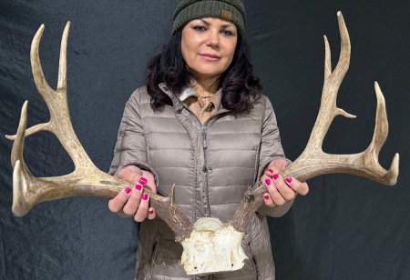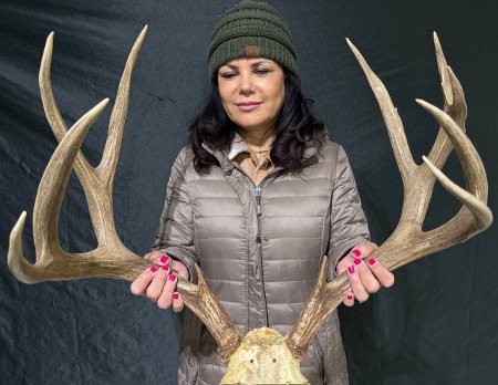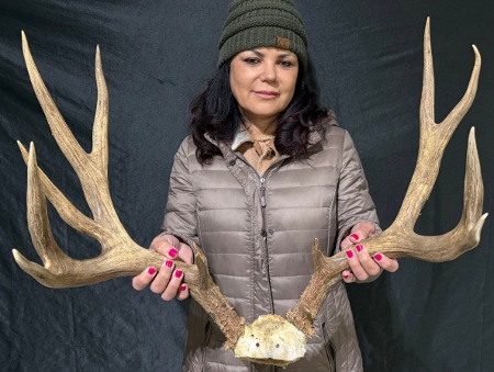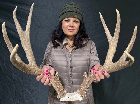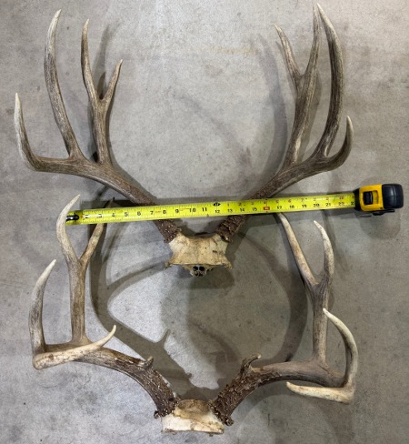 MD-660 BIG MONTANA RACK SCORING 188-3" GROSS BC WITH ESTIMATED 20-0" INSIDE SPREAD~ BROKEN SKULL PLATE~ H1'S ARE 4-5" AND 4-4"~ G2'S ARE BOTH 15-0"~ HUGE G3'S AT 13-6" AND 13-0"~ MAIN BEAMS ARE 24-2" AND 21-5"~ OK COLOR WITH NO CHIPPED TIPS~ RIGHT SIDE IS A TINY BIT FADED WITH A COUPLE TINY CRACKS, RIGHT SIDE ONLY~ BIG HEAVY MULE DEER~ $300 |