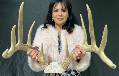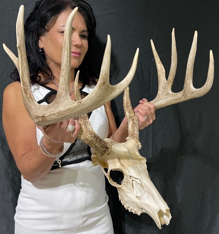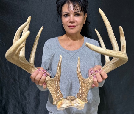 WT-1451 GORGEOUS WILD WHITETAIL SCORING 150-3" GROSS BC ~ OUTSIDE SPREAD IS 19-5"~ H1'S ARE 4-3" AND 4-2"~ LONGEST TINE IS 10-6"~ MAIN BEAMS ARE 22-2" AND 21-2"~ ONE TINY NATURALLY CHIPPED TIP OTHERWISE FLAWLESS~ $250 |